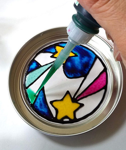 すでに描かれた絵柄に透明感のあるインクで塗り絵のように簡単でステンドグラス風に仕上がります。 インクが乾けばお持ち帰り出来ます。
