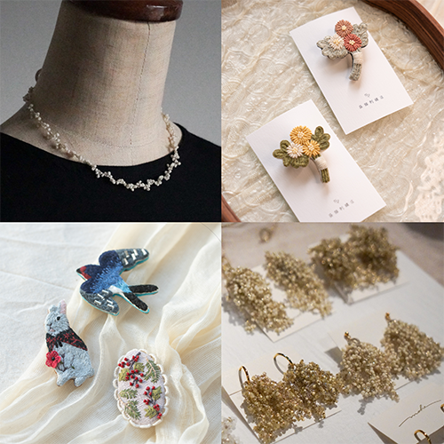金属のようない糸で編んだ繊細なアクセサリーと丁寧に縫い上げた刺繍作品をご用意しています。
