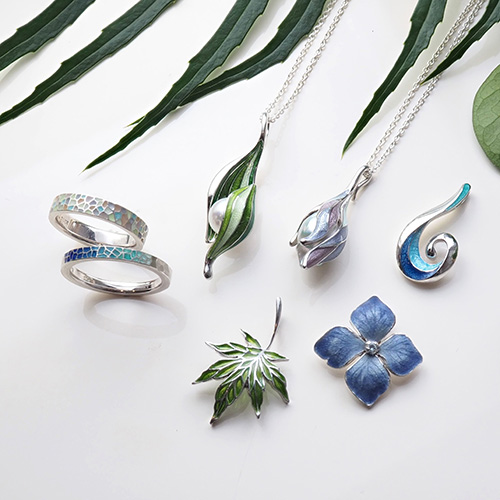 自然の光や景色の一瞬を銀とガラス釉薬でかたちにし、重なり合う色と質感が静かな余韻を生むエナメルジュエリーをお届けします