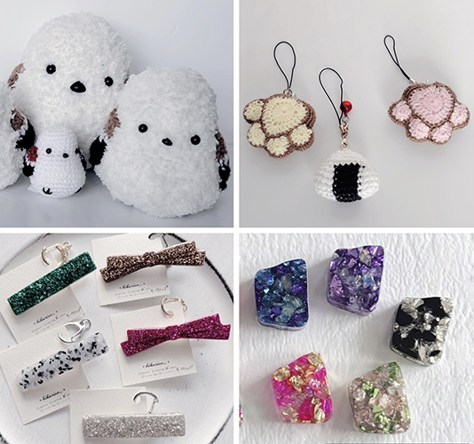 あみぐるみ、がま口、ボーチなどほっこり楽しんでもらえるもの。ビジューレジンや粘土アクセサリー、帯留などがあります。ぜひご覧ください。
