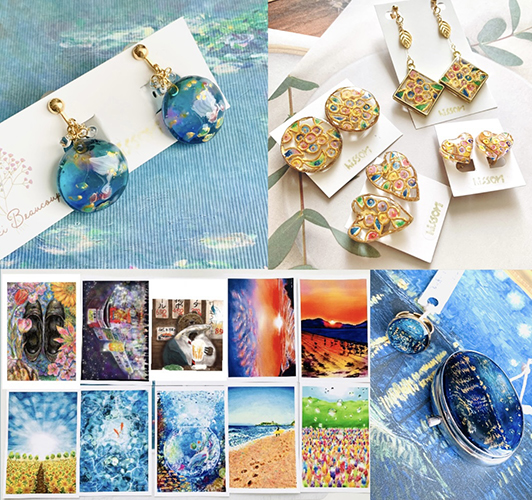 キットパスで描いたイラスト雑貨と、 名画(パブリックドメイン)や花をモチーフにしたレジンアクセサリー
