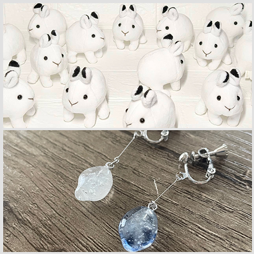 うさぎのぬいぐるみと雑貨を作っているふくうさぎと、アクセサリーと粘土小物を作ってるおてんきやの共同出店です。