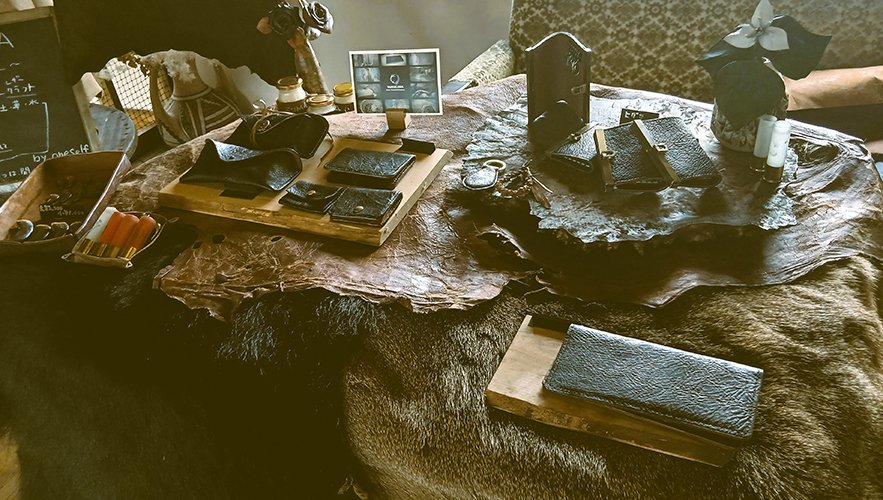 狩猟で得た熊、鹿等の角・脂・毛皮・革など多様な素材を用い、命と自然の循環を作品に込めて手仕事で表現します。