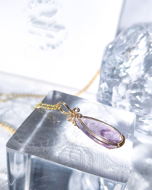 選び抜いた穴の空いていない天然石を14kgfワイヤーのみで包み留め、石本来の美しさを引き立てる一点ものです