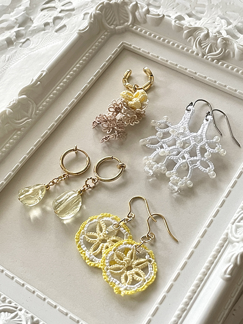 心華やぐ優しい彩り&仄かな煌めきの大人ナチュラルなアクセサリー。タティングレース、天然石、ガラスビーズでお仕立てしています。