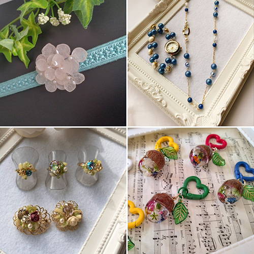 本物のお花のアクセサリーと煌めくビーズの大人のアクセサリー。ブローチ、帯留め、指輪、ネックレスなど。