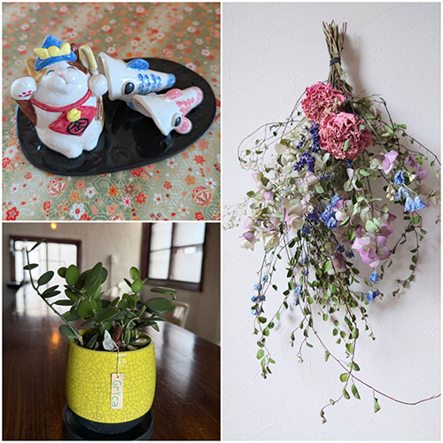 猫をモチーフにした陶芸小物、生活を彩るこだわりのグリーン、優しさあふれるリース・スワッグなど共同出店です 楽しくおしゃべりしましょう