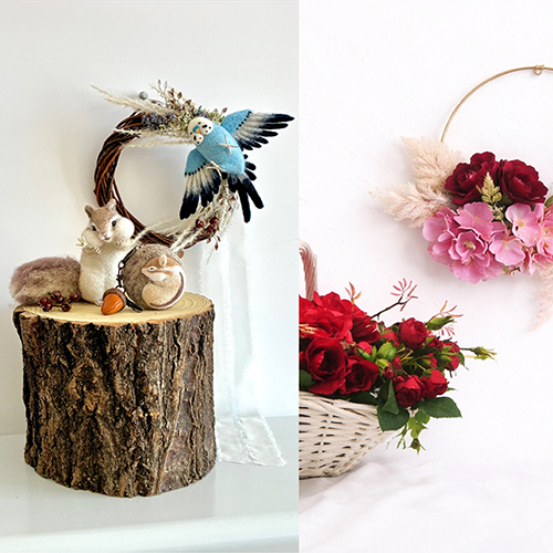 羊毛フェルトで動物達のかわいいシーンを表現した商品です♪ 結婚式のブーケやコサージュ、日常生活にはリースを、造花なので枯れることない彩りを!
