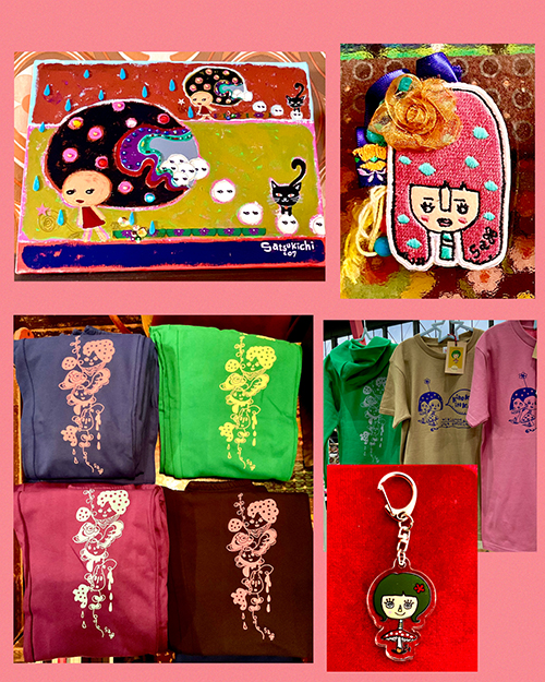 独自の世界観でキノコモチーフのイラストを軸にTシャツやスウェットパンツ、ステッカーや刺繍ブローチなど、カラフルでレトロな雰囲気の雑貨を販売。