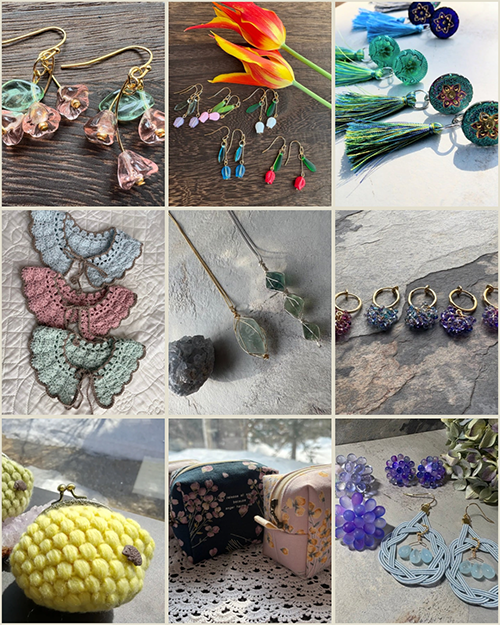 チェコガラスや天然石のワイヤークラフトアクセサリー、布小物、手編みの小物など。ひとつのブースで色々楽しめます!