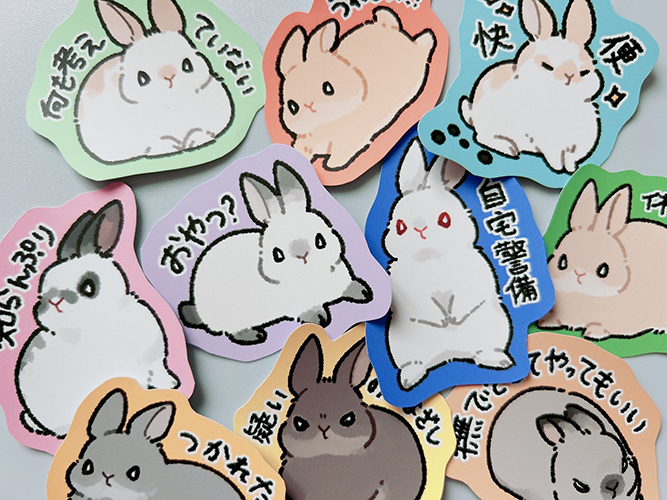 ステッカー、キーホルダー、Tシャツなど、うさぎのイラスト雑貨を販売しています!
