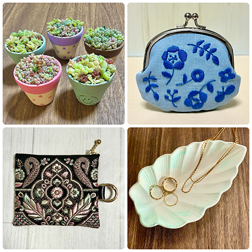 刺繍や、こぎん刺ししたがま口、多肉の寄せ植え、手編みの巾着、バネ口ポーチ、小物トレー、アロマストーンなどを販売!