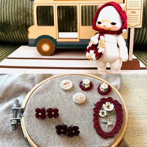 編み物で小さなお人形のお洋服や小物、アクセサリー等の小物を作っています。
