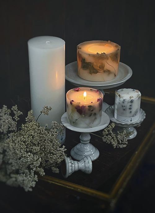北海道の野草や花農家の草花を用いたキャンドルとオリジナルの釉薬を使用した1品ものの陶器の燭台などを作っています