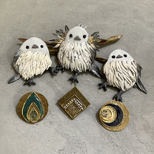 北海道の鳥や個性的な鳥の革製ブローチで胸もとを彩ります。真ちゅうのブローチやピアス、イヤリングでクールに彩ります。