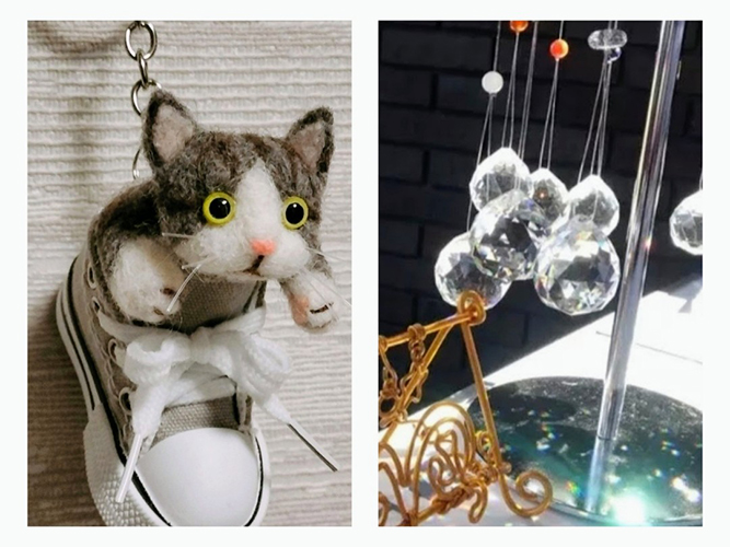 猫の羊毛雑貨をはじめ、羊毛を使った猫の絵も描いています。そして天然石で作られたサンキャッチャーでは癒やしと元気をお届けします。