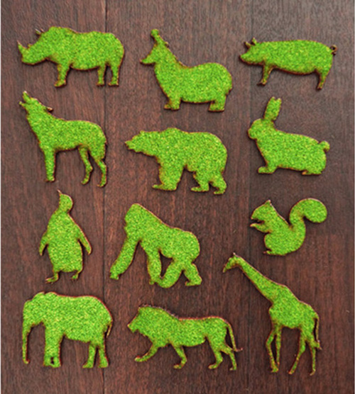もふもふ芝生のアクセサリーshrimpシュリンプです! 芝生に触れて楽しむブローチやキーホルダー、シールの動物・恐竜モチーフを作っています!