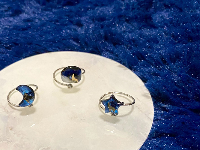 月・海・星・オオカミをモチーフにした幻想的なレジンアクセサリーと雑貨。物語を感じる一点ものと、気まぐれ作品も並びます。