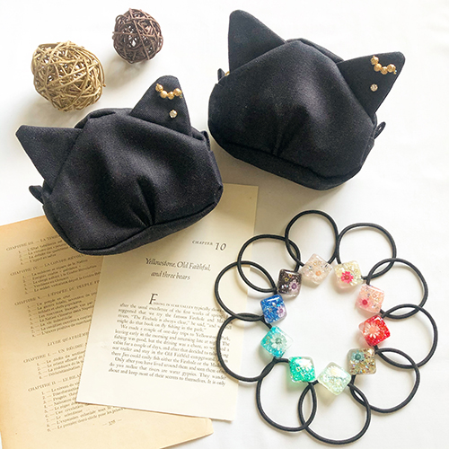 デニム&レザーにゃんこポーチやレジンヘアゴム・コットンパールアクセサリー・真鍮リング&バングルなどカワイイからカジュアルまで用意しています♡