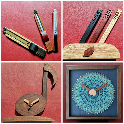 ボールペン等のステーショナリーや色々なケース、時計等の楽しい作品。糸かけは、カラフな糸の重なりがつくり出すアート作品。