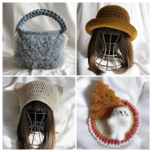 かぎ針編みで可愛いスセミたわしや猫耳、うさ耳帽子、ビスチェなど盛りだくさんでお待ちしております。