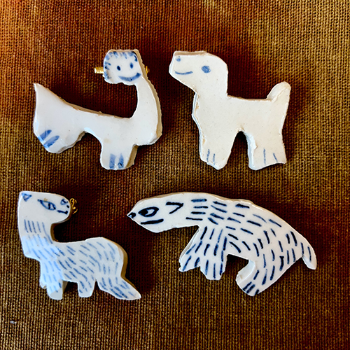 不思議な形に即興で絵付けした陶芸アクセサリー。同じものは一つもない、台紙にもお客様のお好きなイラストを描いてお渡しいたします。