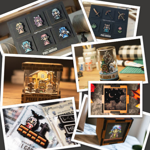 ピクセルアートのキャラクターや地形などを完全オリジナルで制作。ライトや置物、イヤリングなどの作品にしています。