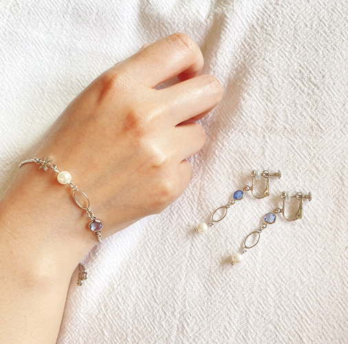 「きらめく透明感をあなたに」 ブレスレットとセット使用も可能な、シンプルで高級感ただようデザイン。痛くなりにくい金具のイヤーカフもございます