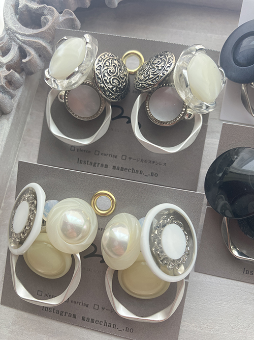 ボタンを使用し製作しています。様々なデザインやボタンの組み合わせで新たに生まれ変わった一期一会なアクセサリーにぜひ会いに来てください。